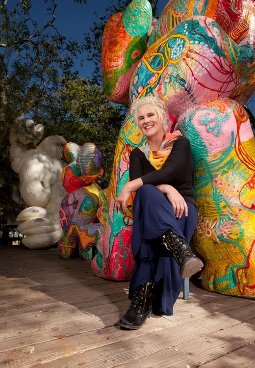 CYBELE ROWE IS THE CLAY LADY PATRICE MARSTERS | MARCH 20, 2015 ORANGE COUNTY'S LEADING SOURCE OF NEWS, CULTURE AND ENTERTAINMENT When some of us were in elementary school, there were art classes. Once a week or so, your class would be lead by an art teacher in creating something with popsicle sticks, clay, paint or the holy grail of childhood art that is papier-mâché. And then budget cuts happened, and those classes were axed entirely or replaced with a monthly Art Masters program, in which kids ape the classics. “The thing that separates us is cultural creative artistry,” believes Cybele Rowe. “And we're skipping a generation.” The world-renowned sculptor aims to change that. ] To read all of our OC People 2015 profiles, click here! “I started Clay Club because there was zero art in schools,” she recalls. To remedy that, Rowe travels to elementary schools throughout the Orange, Tustin and Placentia-Yorba Linda Unified School Districts, getting little hands around clay and creating pinch pots, animal-shaped cups, lidded vessels and more. She fires the results in a kiln located in her Silverado Canyon studio. The structure sits just off her well-lit home, a 100-year-old, window-framed dance hall built by the Army Corps of Engineers. The artist shares the space with her husband, their two children, a dog, a cat, two guinea pigs and some fish. And her art, many of which are enormous. Australian-born Rowe is actually well-known for doing things big. Her ceramic works are larger than life–even big enough to stand in–and can be found in the private collections of Will and Jada Pinkett Smith and Halle Berry, as well as in such public places as the Australian Consulate in New York. Though she's been invited around the world to create and teach, Rowe traverses Southern California regularly, inviting inspiration. Along with Clay Club, there are art boot camps and art classes; during a regular week, the youngest of her students is 5, and the oldest “somewhere around 90.” Last year, she started an Art Survival course to help Saddleback College students see they can make a living out of what they love to do. “If I can produce inspiration and confidence in these students . . . then they're going to go back into their communities with that,” she says. Maybe even something as imposing as the extremely tall, surprisingly lightweight sculptures on her back patio. Filled with movement, with expression, with the joy of their creator, they are unlike anything you've ever seen–or felt. It takes just a nudge to move one. A man wanted to commission a piece for his boat, Rowe explains. But ceramics at that size are too heavy–“His boat would sink!” she exclaims with a laugh. So she went about finding a new medium. She studied buoys, surfboards, things that float. “I worked on a technique to make sculptures with my hands using ancient technology–what's found in France, in China–but contemporized,” she says. “I said, 'I'm going to make a lot of ugly art and come out the other side with beauty.'” And then she laughs melodically because she did just that. These giant creations seem to showcase the rhythms, the ups and downs of her feelings. “[If] the viewer can just unhook their preconceptions of what art means in their life,” she says, “they'll get that same state of flow as an artist, and that's hugely powerful.” Just as powerful are the “skins” painted onto these newer forms. When her longtime friend and fine-art painter Kaye Freeman visits, she attacks Rowe's creations. “She's a better painter,” Rowe says, laughing. (If you look closely, though, you can see Rowe's scribblings under the paint.) “It's a really cool way to live,” says Rowe, “making huge abstract works of art, then having your best friend come over and color all over it.” The results are part of what they're calling “The Love Armada.” “If I didn't have balls the size of Texas to build these big things,” Rowe says, “then the kids wouldn't have that confidence.” To read all of our OC People 2015 profiles, click here! Follow OC Weekly on Twitter @ocweekly or on Facebook! PATRICE MARSTERS Patrice Marsters started at OC Weekly as an intern, just before the first issue was published. She is now the associate editor of the paper, serves on the board of the Orange County Press Club, and mentors aspiring writers and editors at Newport Harbor High School. In her spare time, Ms. Marsters co-leads a multi-level Girl Scout troop, creates baked goods, and rants at inanimate objects (including her computer) about her grammatical and writing pet peeves. ARTS & CULTURE